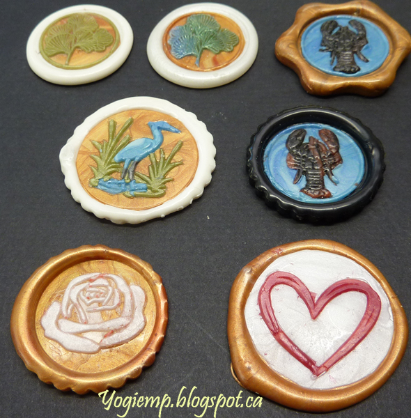 Created: Oct 31, 2024 Size: various dia Playing with my crafty dozen friends again... I'm getting better with the bulges except for the bottom 2 but they are an oversize seal so not easy... I guess practice eventually makes perfect. I borrowed my friend's ginkgo stamp (upper 2 on the left). I have now put an order in for one... Love the lobster stamp (I'm also extremely partial to lobsters. I can really pig out on them...) The bottom one is better than the top one having a bit of red running through it's shell. Next time I'll do cooked ones... The heron turned out OK except for that little bubble in the wax border. c'est la vie... The heart and rose are BIG stamps and hard to position properly for the last pressing. I'll get better BIG GRIN. |