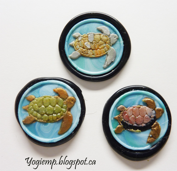 Created: Oct 18, 2024 Size: 1.1"dia Playing with my Turtles... This is the last of my recent shipment of wax seals. This one is not an easy one to work with if you want multiple colors. The top one is my favorite and the last of the 3 I made. Boy... did I have problems making that one. The wax stuck in the little crevices- frustrating. I guess I had a bit of silver still stuck in one of them sigh!! But my thickness around the edge is getting better. |