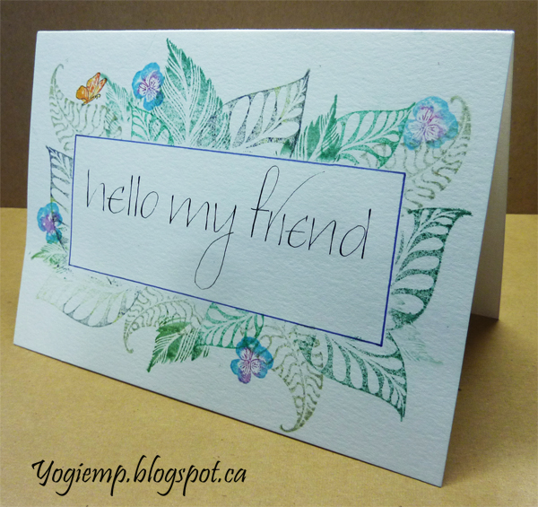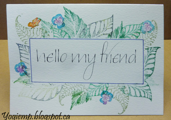 Created: May 1, 2022 I signed up for the Whimsical Starts Workshop 2022 hosted by Kelly and Yvonne Barone on Facebook/ZOOM This technique was taught on day 1 by Vera Cruz. She hand made fun foam leaf stamps to create her border. Using misc watercolor paper. I used Designs By Ryn rubber stamp leaves to create my border. Cut a piece of paper the size I wanted to protect, adhered with a piece of tape and then stamped various leaves using Distress pads and misting lightly with water. Bordered with a blue Zig Writer. Wrote in the words using a pointed nib and Sumi ink in Weaver Style writing. |