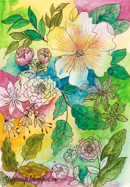 Created: June 13, 2023 I signed up for the Workshop Week 2023 hosted by The Happy Ever Crafter on an online platform Thought I'd play along while I watched during the broadcast. This artwork was taught by Megan Wells "Funky Florals Art Journal". I really like the end result but not sure what I'm going to do with it... On Fabriano 1264 CP w/c paper, painted the background with washes of w/c (mainly Winsor & Newton and some Hoblien), dried. Added the florals, foliage and doodling with Juice Up pens. Then enhanced the background colors and painted some of the foliage. |