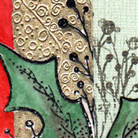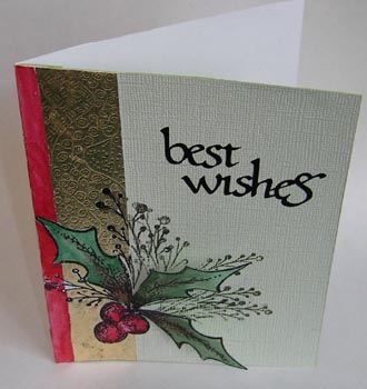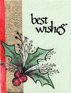 I used a white cardstock for the gilded strip and rubber stamped holly leaves. After the gilding I cut around the leaves and then adhered it to a "Stonewashed" cardstock in a greenish tone. Rubber stamped the sprigs onto the new piece of cardstock. I used Mona Lisa size mixed with a bit of yellow ochre Gouache and composition gold leaf. Painted in the red border and coloring on the holly. Did a dry emboss technique on the gilded area. The "Best Wishes" is one of my calligraphic Peel Offs available from Elizabeth Craft Designs.Below you can see a bit of the leaves standing away from the card. |