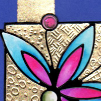 I used a blue cardstock, gilded the strip just within the design confines, using Mona Lisa size mixed with a bit of yellow ochre Gouache and composition gold leaf. Placed the Peel Off abstract flower (Elizabeth Craft Designs Peel Off) onto some white cardstock, applied the size and composition gold and dry embossed it, then adhered it to the card. Added some faux rhinestones in a pink tone. Colored the petals with Tombow markers. The word sentiments are some of my calligraphic Peel Offs available from Elizabeth Craft Designs.