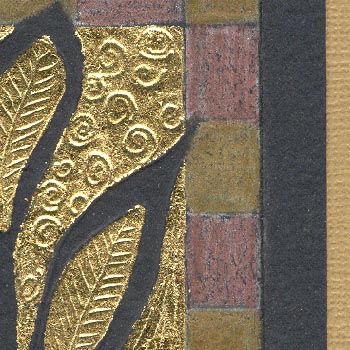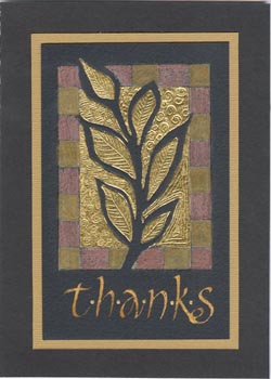 I used Arches black cover for the main design. Used composition gold leaf with Jerry Tresser's size. I then used various stylus points for the embossing. Colored in the border area first with a white Prisma colored pencil then with Super Ferby metallic pencils (in a beige gold and a copper tone). Wrote my word "thanks" with a Mitchell nib and a mix of some golds and other colors to produce a brownish golden shade. I then added gold leaf dots between each letter. Cut out my design and layered it onto Bazzill monochromatic beige toned cardstock, then onto a heavy black cardstock. |