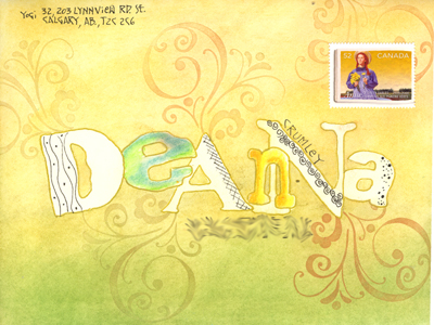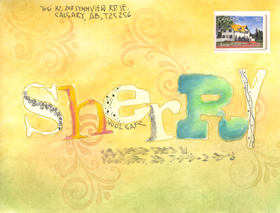The envelopes were made with Columbia Mills end sheet paper. I used Tim Holtz Ideaology alphabet masks to mask out each name, then colored the background with Pan pastels in the shades of the Anne of Green Gables postage stamps. Rubber stamped the flourishes with Perfect Medium while the masks were still on and colored the stamped image with Perfect Pearls "Forever Copper" & "Forever Green". Removed the masks and decorated the letters by outlining them with a gold gel pen and then either some colored pencils or micron pen designs. Sprayed it with fixative. |