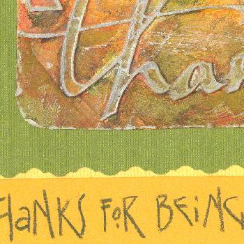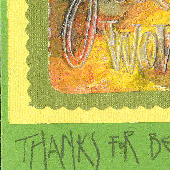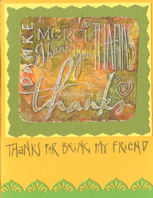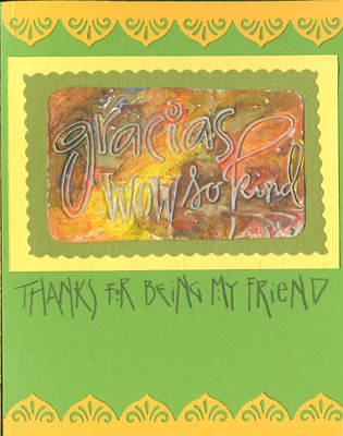 unsanded which still have some gold and then the high points of most letters are now silver. I then put a layer of Golden's Matte Medium. Theny were mounted to textured cardstock, trimmed with a scallop or deckle edge rotary cutter, then mounted to a yellow piece of Monochromatic cardstock, then onto the main card. I also added some punched out trim made from one of the leftover cardstocks using the EK Success Moroccan lace border punch. Wrote in the words with a Prisma colored pencils. |
