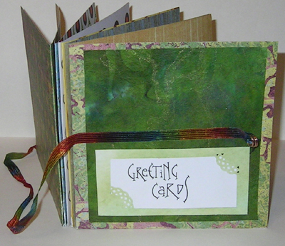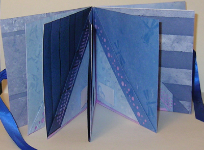 I used papers from a Michael's Slab series of papers, coloring the wrong side (which was white) with Pan Pastels in magenta, purple and blue tones. Part of the paper gets cut away to lessen the bulk of the booklet and those I used on alternate pages as design elements. Also the diagonal fold, usually folds to the inside and I folded it to the outside using various border punches. Nice accents happened because of this, allowing the underneath colors to shine through. I added a very heavy textural blue mulberry paper to the front and back and cut out the "cd's" word with my Cricut, first coloring the cardstock with Pan Pastels, then running through my Cuttlebug with the Swiss Dots folder and after cutting swiping a Distress Blue Jeans pad over the high points. I had initially glued my ribbon around completely, but after making the second booklet, realized I needed the spines to be able to expand, so I cut the ribbon and glue it to the inside spine sections. Each page also has a corner adorned corner to insert a removable label if so desired. I left them blank for this booklet. |