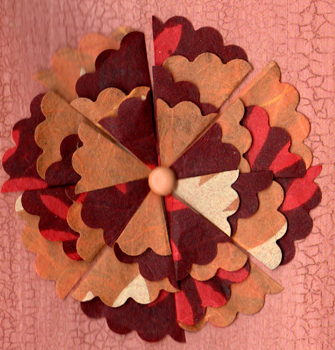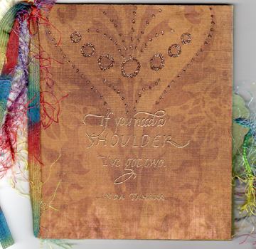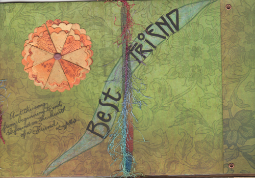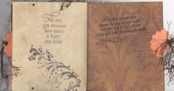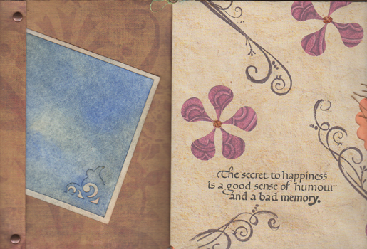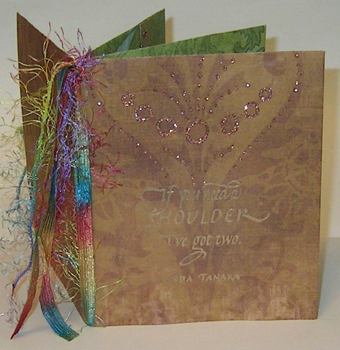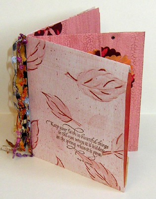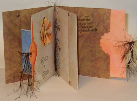 Created: Oct 7, 2009 The three booklets are samples I made for a Day of Crafts project I taught, given by our Guild. They have some rubber stamping, thermal embossing, glitter, punched decorative elements, pages colored with Pan pastels, some beads and ribbons etc. The are partially blank for further personalized embellishing. There are areas to insert a picture or something else, sections to insert a note and hidden tags to write private messages. All of them use one sided scrap book pages, with sections of the wrong side colored in if visible when booklet is made. All the booklets include an origami flower, hand colored & decorated on one side and usually attached with a brad.