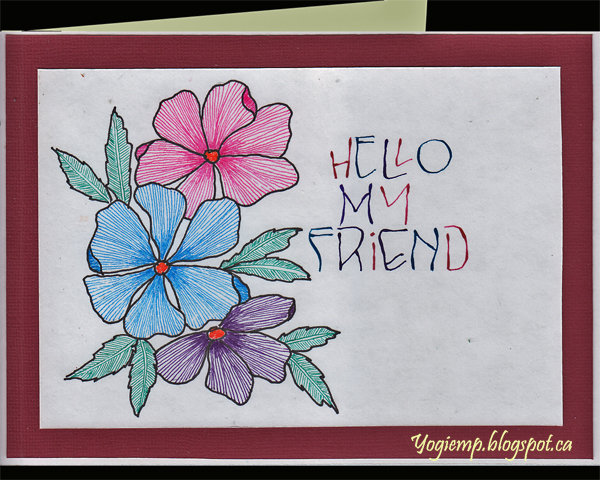 Created: November 15, 2022 Someone on line recommended these Pilot Juice Up 0.4 pens saying they didn't clog up like regular gel pens and they started writing without any fussy prepping to get them started... I was intrigued... So I bought a bunch of them. Love them BIG GRIN. My only disappointment was that they are a very fine tip which I hadn't realized... But I love them anyway. On Bee Super Deluxe white paper started drawing the linear flowers with various colors of my 12 pack of pens... Wrote in the words in "Art Nouveau/Deco" style lettering. Trimmed down and adhered to a rusty red cardstock and then onto my white card base. |