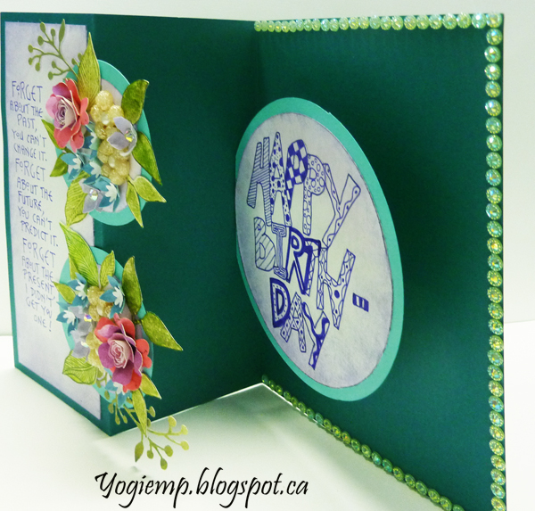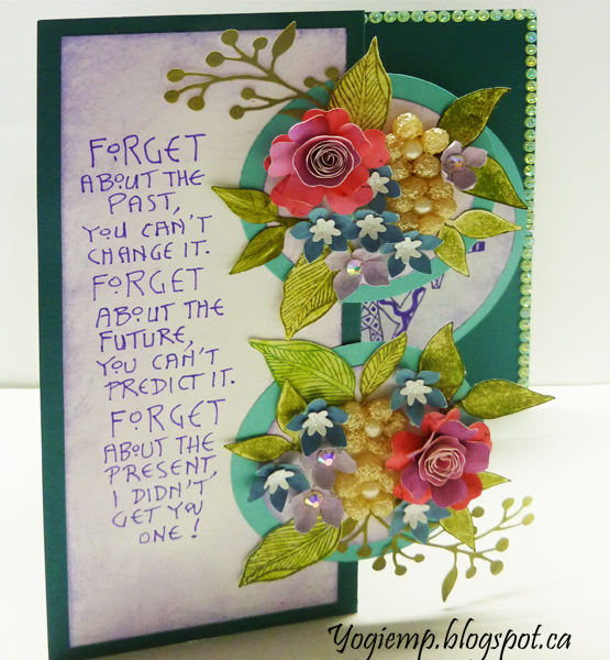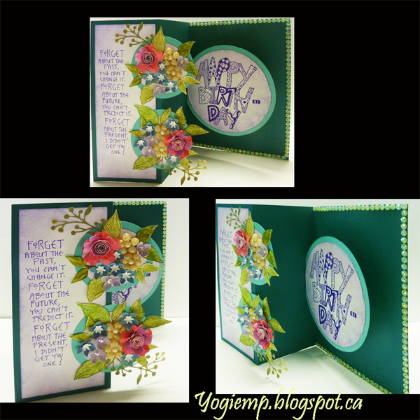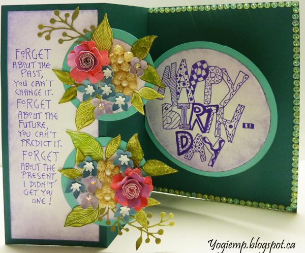 Using Recollections "Cool Water" cardstock pack. Used the green for the card base. The aqua for the circles and then white cardstock for the inner circles and front panel, sponging some Distress purples around the edges. Drew some funky lettering for the "Happy Birthday" doodling inside each letter with a purple Zig Writer. Front quote: Forget about the past, you can't change int. Forget about the future, you can't predict it. Forget about the present, I didn't get you one! Raided my stash and added a bunch of 3D flowers and leaves. |