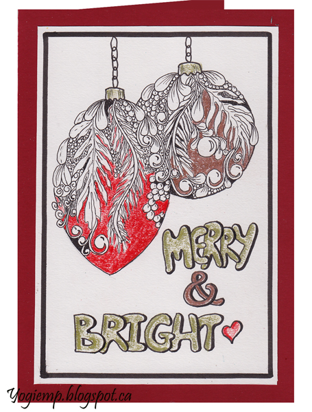 Created: December 1, 2023 I don't make Xmas cards anymore... but was in a mood to do some tangling... On Canson Mixed Media paper using a Zig Writer created my ornaments. Used a Juice Up pen to doodle and colored pencils both Prisma & Super Ferby Metallic. Added a black border then adhered to my card base. |