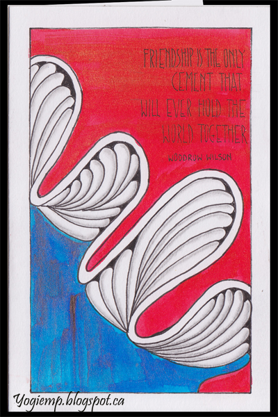 Created: February 19, 2024 Size: 5"w x 7"h On Fabriano Mixed Media heavy weight paper created my card. Using a Zig Writer for the outline of the doodle and border edge. Painted the open spaces with deAtraments Pearlescent ink (Camelian Red - Gold & Cyan Blue - Copper). When dry, shaded the doodle with a Caran d'ache B graphite pencil and blended with paper stump. Text with a black Juice Up pen words: Friendship is the only cement that will ever hold the world together. Woodrow Wilson |