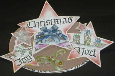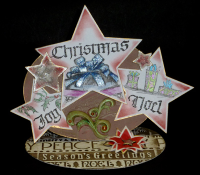 only the words. I die cut the oval easel card with a Spellbinders Ovals Grand set, put one edge shy of the die so it wouldn't be cut off from white cardstock. I cut 2 more ovals the same size for the floor and the front. The one for the floor, I put through my machine with the Cuttlebug "Seasons Greetings" folder #37-1931. Since the width of the oval was larger than the folder, I placed my folder on either side of the already embossed area, lining up the words and used my hard rubber mallet to emboss the design. I used a direct to paper over the high points with Distress Pumice Stone, and clear embossed it. I die cut 3 smaller stars, sponged with the red, slit down between each star point to create petal type shapes and curled them. Edged the lowest one with the gold leaf pen and attached all three with a silver star brad attaching it to the floor as well, then adhere the floor to the main card. The other oval I painted with Distress Crackle medium (Frayed Burlap), allowed to dry, then smeared Aged Mahogany all over and wiped off excess. PS, my crackle mediums seem to dry out all the time, so I add water, mix well and they definitely still work... and they're easier to apply since it's a thinner mixture. Adhered my stars both direct to the oval and some with pop dots. Adhered the oval to the front of the card. Adhered the flourish ornaments, which were made from Air Dry Polymer clay and painted with Perfect Pearls, with Golden's Extra heavy gel medium. |