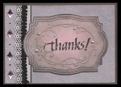 Created: August 29, 2011 My friend came over for some shopping and a play day and she had brought some embossed folder parts she had cut out using the Cuttlebug Lacy Labels. Now I had gotten that folder, really loved it and told her about it, so she went out and bought one and actually used it - BIG GRIN. Well I got inspired and I said lets make a JPG of it to cut with my electronic cutter... Well it worked and this is the result. I'm also using a sentiment stamp from the Thanks set from Quietfire Design |