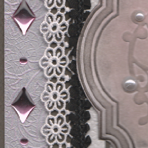 way it turned out. Stamped my sentiment with Versafine Black Onyx and added some white half pearls in various sizes. The main card is a deep textured grey that I picked up eons ago. Then put a piece of the metallic papers I recently bought in a silvery grey with such a pale pink embossing to be almost non existent - but just there... Next came the stripes of the same deep grey, a piece of white lace trim on the grey so it stands out a bit more, a piece of white textured metallic paper and a black piece of twisted type ribbon trim. And then i added those pale pink diamond stickers. |