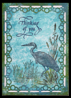 (Bubbles). Love the way it turned out. I first used Distress stamp pads, direct to paper, Broken China, Faded Jeans & Peeled Paint, then punched the frame. The white areas are little pieces I cut away that would normally be where the corner of the photo would slip in. It's not necessary, but I wanted a bit of contrast. I then did another piece of white cardstock, this time with Tumbled Glass, and Broken China. Stamped my heron (Old Island Rubber Stamp #211F) with Versafine Black Onyx and a touch of Moss Green. Stamped it again, but only the grasses and water section. I then masked the bird body and stamped the Bullrushes (Onyx Xpression "Cat o Nine Tails #TR-4214). Layered it all onto a white main card. As a final touch I painted the bird with a coat of Winsor & Newton Iridescent Medium. (hard to see in the pic above) |