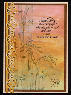 and then lightly wiped it off. Stamped the quote with Versafine Black Onyx and clear embossed. Stamped the little sentiment at the bottom (Flourishes) with the black also. Die cut the border (Spellbinders "Parisian Accents" #S5-034) from white cardstock, dry embossed and sponged with Distress Walnut Stain. I then swiped Spiced Marmalade and Scattered Straw over the whole thing, leaving some white areas. On the main cream card I layered a dark brown cardstock from Core D'nations "Elements" pack, then my sunset piece, then my border piece. |