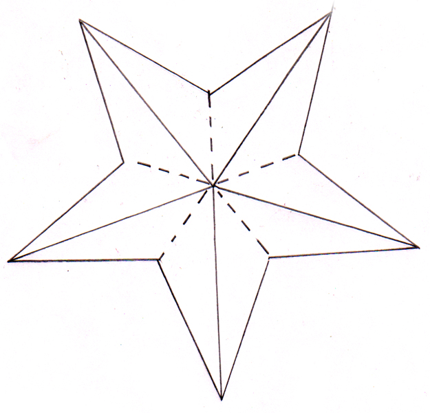 ![]() Score from star point to opposite edge along solid & dashed line. Hand crease fold line along solid lines only. bring two star points together along creased fold lines, which pushes the dashed line to become a valley fold. Repeat on all star points. |