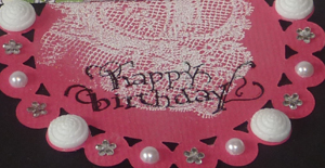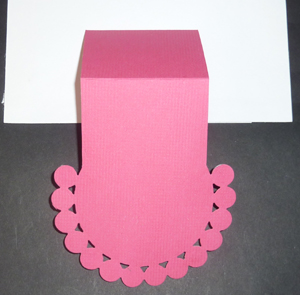 Since I didn't want my whole Spellbinders Beaded Circle cut out, I used a rubber mallet to die cut the section I wanted from some watermelon toned textured cardstock. I then cut the strip that would hold my card piece. |