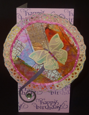 The main card is white (only 3.5" w), layered edge to edge with a pink cardstock, repeatedly stamped with happy Birthday using Versafine Imperial Purple. Since the circle was made with several layers of papers and cardstocks, the side edge was a little messy, so covered it with some Tissue Tape. I don't usually use that stuff and I wasn't that happy with it. One of it's characteristics is it's repositionable. So you got it, it kept lifting and I wasn't happy. I then punched out Swirling Lace border (Martha Stewart - punch around the page border punch #42-60051) from some variegated scrapbook paper. I pinched it between the scallops and adhered it to the edge of my circle - now that edge looked better, but just to finish it off, I added a very thin rose toned ribbon. Now to make this a funky flower, it needed a stem, so out came another piece of decorated paper in deep purple tones. Die cut it with Spellbinders Doodle Parts (#S4-121) and sponged some green on it (hard to see). I die cut the butterfly from some of the variegated paper from above with Spellbinders "Flying Beauties" (#s4-123), run through again to dry emboss then sponged some Distress Broken China & Tattered Rose. Adhered some floral stamen, adhered to circle and added the rhinestones. Also added a large green toned rhinestone to the flower stem |