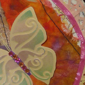 Created: February 20, 2011 I was in a mood to use up some of my humungous pile of decorated papers. So I deckle edged pieces cut from my stash - a fun bunch of unusual colors, some done with used Kleenex from a painting or calligraphy session - I'm smiling when I look at it, then sewed them on to some thin cardstock. I'm entering it in several challenges and some of them call for non square card, so that started me in the direction I needed to go. So I cut out this 5" circle, looked at it for quite a while, adding this and that and not being happy. What to do with this huge circle... The background is stamped with the happy Birthday stamp from Quietfire Design. |