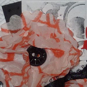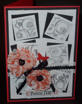 Created: January 21, 2011 I was surfing the web and came across some flowers made with a scalloped die and then fluffed up. I really liked it so thought I'd make a few. I used 4 layers of tissue paper which I stamped with a large background stamp (Harmonie "The Treasure") first using Versafine Habanera stamp pad. Tied the layers together with 2ply waxed linen black thread and a black button. They remind me of Poppies. The sentiment is by Quietfire Design. |
