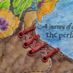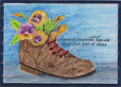 Punched holes in the shoes and added red eyelets for my laces. The are jute colored with a red Bic Mark-It pen and adhered to the back with a dot of glue from a mini glue gun. Stamped the quote With Versafine Black Onyx. added the stitching on the show with a brown Zig Writer and some white detail in the flowers with Enamel Accents and blended out with a paint brush. Distressed the edges with Rangers distressing tool, then layered it on to a dark blue Bazzill Monochrome cardstock. Added staples using Tim's Tiny Attacher in a criss-cross pattern to mimic faux stitching. |