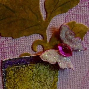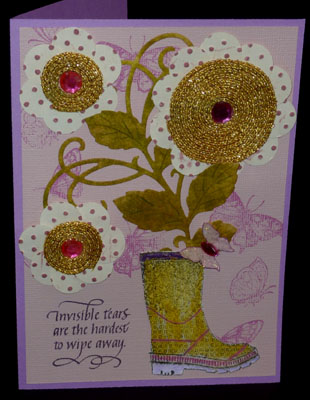 For the second card, I layered a piece of Core'dinations light pink from the Nostalgia pad onto the mauve toned main card. Rubber stamped various butterflies (Flourishes sets "Gerbera Daisies" & "Clematis & Butterflies") using Memento "Lilac Posies". I sponged various Distress greens and a bit of brown (Peeled Paint, Crushed Olive & Brushed Corduroy) onto a piece of white cardstock to create the background for my leaf/flourish die cut (Heartfelt Creations "Belle Rose"). Added veins with a colored pencil. Stamped the rubber boot (Darcie's "Plant, Grow, Bloom" set) with Versafine Black Onyx, then brushed on "Mustard Yellow" distress and colored the rest with prisma colors in mauve & pink, then added some Ritz micro fine glitter on the rim with a Quickie glue pen and Lavender glitter. Cut it out and adhered to card, then adhered the leaf/flourish, then the flowers. Stamped the quote with Versafine Imperial Purple. The little butterfly was punched out from some misc cardstock using a Martha Stewart punch, micro fine glitter "warm highlights" covered the wings and I touched the edges with a Tombow purple marker and added a pink rhinestone body. |