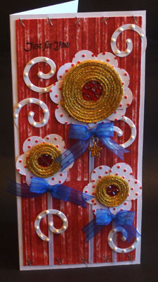 I came across these coiled flowers in a rubber stamping store done with twine and a misc thing in the center. Came home and made a bunch, but using glittered metallic cord and regular & floral rhinestone centers. I then did another of my twists and added circles to mimic the petals. Really like the way they turned out... The red/white & blue card uses white cardstock and Barn Door for the high points of the embossing, the mauve pink card uses cream toned cardstock and Victorian Velvet. The thread is Needloft Craft Cord "Gold Frizette" #55034. Both cards use a sentiment or quote rubber stamp by Quietfire Design |