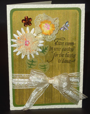 I did a running stitch on the edge of the lace, then gathered it up into a tight circle. One of them I also sewed the edges together, the other I didn't need to bother. I also got these yummy Prima E. flowers in a white and yellow tint. Then I punched out a small Sakura flower from some leftover decorated paper I had on my desk. Layered everything together with some glue and then put a couple of stitches through it all and through my cardstock. I added a half pearl. The card is a cream tone which I edged with an embossing folder (Sizzix Flowers #6 from the #656978 set) and my trusty rubber mallet. The next two layers are a beautiful Dupioni silk in a golden color with a green tint that I picked up today - just gorgeous material at $30.00 a meter - but it was on special and I only bought a 1/2 meter. I adhered it to a piece of Heat 'n Bond with my iron, cut down to size and ironed it on to the olive cardstock. I made a peg bow from this beautiful ribbon I picked up at the same time, attached the horizontal piece and sewed the bow to that. I think I was in a sewing mood - I normally just glue these things. |