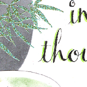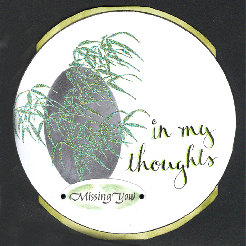embossed with Green Patina. Wrote in my words with a Nikko G nib and Sumi ink and added light green shading with a colored pencil. Stamped my mini sentiment with Versafine Black Onyx on a scrap piece of white cardstock and die cut the oval, sponged some Distress peeled Paint around the edges. Adhered to circle and added the black mini rhinestone. Adhered the circle to a rectangular card which I sponged with the Peeled Paint, then trimmed down to follow the shape of the circle. |