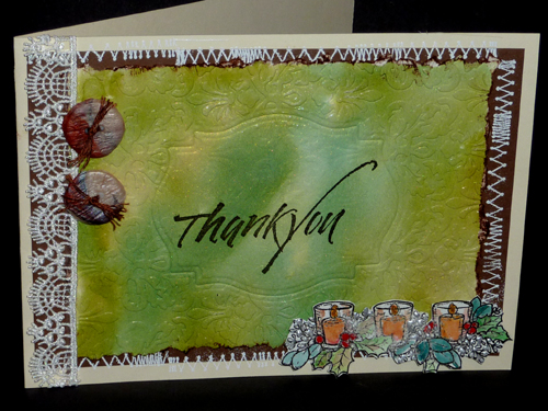 Pearls "Sunflower Sparkle" and dried. Die cut the Labels 18, double thickness, from 110# cardstock to use as my embossing mask. Sandwiched my background paper in my embossing folder (Cuttlebug Kassie's Brocade #200215), placed my mask on top, then ran through my machine. Then I placed the die in the section that stayed flat because of the mask and used my tan mat to emboss the edge of the die. Ran a Perfect Medium pad lightly over the high points and clear embossed. Stamped my sentiment with Versafine Black Onyx. Tore the edges of my background and distressed with Distress stamp pad Vintage Photo. Cut, folded, spliced a side folded card. Layered a dark brown cardstock. Stamped the stitching (Tim's "Spring Sprung" set) with Perfect medium and embossed with white embossing powder. Adhered my background piece, added a piece of lace on the left side and 2 polymer buttons I made a while back, tied with brown embroidery floss. Stamped the candles (Flourishes "Christmas Candles" #SS172) with the black on the watercolor paper, clear embossed, painted with watercolors and cut out. Adhered to card with pop dots. Added some gold glitter on the flames and some Liquid Pearls "Pearl White" on some of the leaves. |
