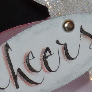 Die cut the two smallest of the Poinsettia (Spellbinders "Layered Poinsettia") from white cardstock, embossed with the Cuttlebug "Swiss Dots" embossing folder, sponged the red on the reverse side of the bottom layer and hit the high points on the right side of the next layer. Used a silver gel pen and colored the dots on the top layer. Adhered them together and added a small red rhinestone. Adhered to card floor as my stopper. Die cut a small oval (Spellbinders), wrote in my word using a Nikko G nib and Sumi ink. When dry, shadowed with a bit of red colored pencil and then an HB pencil and a paper stump. Used a Silver leafing pen to edge the oval. Attached to card with a small silver brad. |