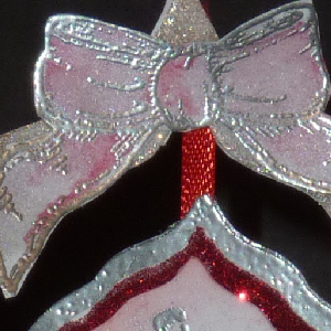silver ornament to the back. Put a piece of 6"w Sookwang tape on a piece of white cardstock and die cut the largest ornament from the set and nesting a smaller ornament to get the cut out to hang my ornament from above. Removed the release paper from the large cut out and sprinkled Ritz micro fine glitter "Warm Highlights" and then "Stardust", burnishing well. Die cut another largest ornament and used the first die cut to place my smaller die to get an exact cut out. Adhered the hanging ornament to the back of the glittered ornament, then adhered the 2nd cut out to the back which hides the ribbon and adds some strength to the ornament. |