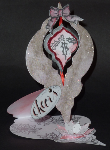 Stamped the bow (Flourishes "Holiday Sparkle" set #173) and embossed with the silver, then painted with some watercolors, cut out and adhered to ornament. Top folded my white card and placed the largest Ornament die just slightly above the fold, then cut it out. Folded the top layer down (note: I made my offset about 1/3 & 2/3). Stamped the Xmas text (Impression Obsession "Christmas Text") on the top of the front fold down so it will peek out of the opening in the ornament. I did a 2nd generation stamping so it would be a bit lighter and more subdued using the Festive Berry pad. Sponged a bit of the red on the underside (inside) of the card. Repeatedly stamped the small Poinsettia (Flourishes "Poinsettia & Boxwood" set #37) on the floor of the card and embossed with the silver. Adhered my ornament to the front folded cut out.