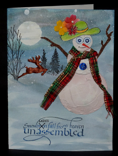 the land. Added the reindeer (fabric ribbon). I die cut the 3 smallest circles from a Spellbinders circle set. Covered them with Aleene's True Snow and let dry. Dabbed distress Stains Victorian Velvet & Broken China, misted with water and Perfect pearls mist, rubbed a bit with my fingers to get just a light shadow/tint happening in the crevices. Stacked and adhered them together. added the plaid scarf cut down from a larger bow, edges fringed. Stamped the hat (SeeD's "Hats of to you") on some scrap cardstock with Versafine Black Onyx. Colored with Prisma colors. Cut out and adhered to snowlady, adding some dyed paper flowers. The eyes are mini blue buttons, covered with Perfect Medium and embossed with white embossing powder. The nose is a triangle of cardstock colored orange and touched with a black micron pen. The arms - I covered a piece of cardstock with Perfect medium and embossed with JudiKins Rustique Tin Can and a touch of Distress Vintage Photo, then die cut with Tim's Sizzix "Branch Tree" and cut off a couple small branches. Adhered to card. Stamped the quote with Versafine Majestic Blue, crossed out the word "men" and wrote in the word "ladies" with a black Zig Writer. |