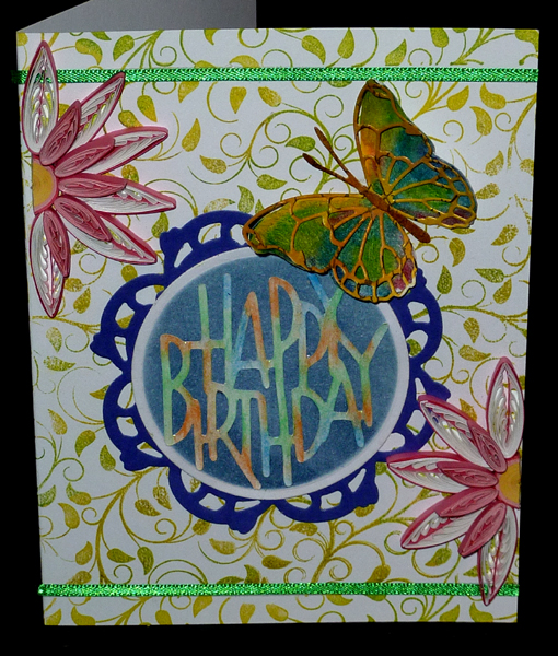 Created: April 13, 2012 There was another session of our quilling group over at Paper Pastimes this week, so was making a bunch of comb quilled petals... Then one of my friends reminded me about the Happy Birthday lettering I had manipulated and cut with my electronic cutter several years ago - so resurrected that file.... then I had this butterfly lying on my desk that I had cut a while back - and voila the card evolved.