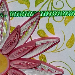 Stamped the background (Impression Obsession CAC Vines) Fluid Chalk pads in 2 shades of green. Stamped it in the center of the card, since it was smaller than my card front. Then stamped it again on the bottom and top edges. Adhered the green narrow edged ribbon on the join points. Electronically cut the words from white cardstock. Used the flat of my colored pencils to color the letters, adhered them to a die cut circle (Spellbinders Standard Large circle), sponged various Distress blues. Applied Glossy Accents to the letters and let dry. Then adhered it to a purple-y blue decorative die cut circle (Marianne Designs LR0168). I did the combing with the white strips, folded it in half and inserted the tail end of the pink strip down the center, glued the ends etc., then wrapped my petal a few times with the pink strip. That was done using the whole comb of 2.5" so the petals ended up being 1-1/8" long. The smaller pink petals used about 3/4 of the comb, with the combing done with light pink strips and the same deeper pink to wrap. The center of the flower is just a tightly rolled coil, starting with a bright yellow, the the light pink and then the deeper pink. I put some glue on the back side, adhered a punched out circle and let that dry thoroughly. The cut the coil in half with an x-acto blade. I adhered the large petals flush to the card. The smaller petals I adhered at an angle so there was more dimensionality. The butterfly was die cut (Crealie's "Vivienne" BFly) from some decorated paper I made a while back. Cut the under layer by hand and colored with watercolor pencils and a water brush, when dry applied Sakura Stardust clear gel pen. Adhered the layers at the body point only then onto the card.