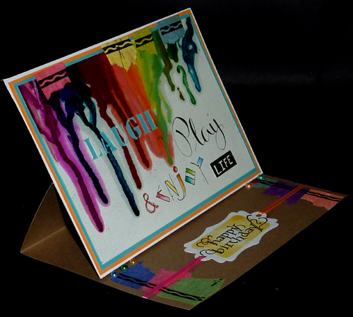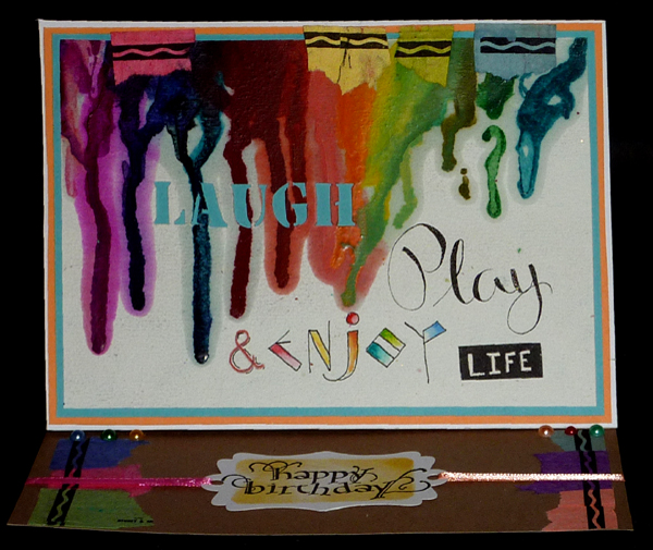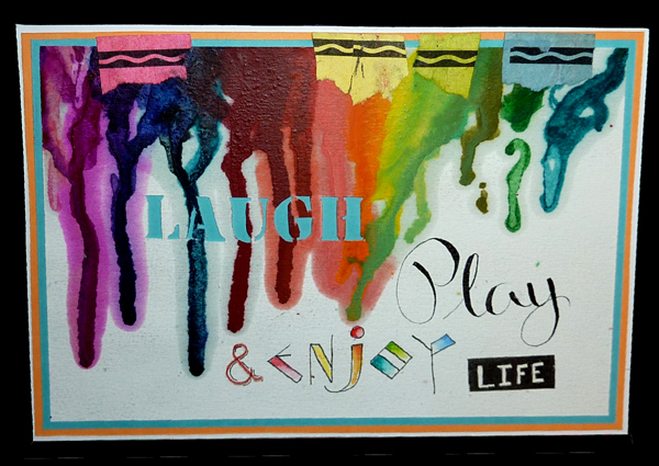 I did the melted crayon work on Arches Text Wove paper and used my heat gun to melt. My Stamping Up heat gun, sputtered and splashed the melting wax... so I switched to Tim's heat gun and that worked much better. Wrote in my words with a pointed pen for "Play", micron pen and Derwent watercolor pencils for "enjoy", the negative word "life" with a Pentel mini pocket pen on some scrap cardstock and then cut out, and the word "LAUGH" cut out from the paper. Layered it onto a mid range blue cardstock then onto a daffodil yellow cardstock, then white cardstock and then onto my Kraft easel card. |