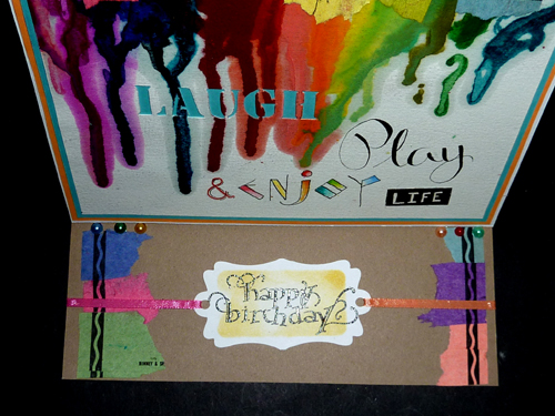 Created: April 7, 2012 I saw waxed crayons placed in a row and then heated to allow them to melt and drip down... It's been in the back of my mind to try it this way, but something always came in the way. Today I came across it again and put everything else aside... This was a fun and spontaneous card and I love it. I'm using the birthday sentiment stamp from Quietfire Design