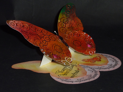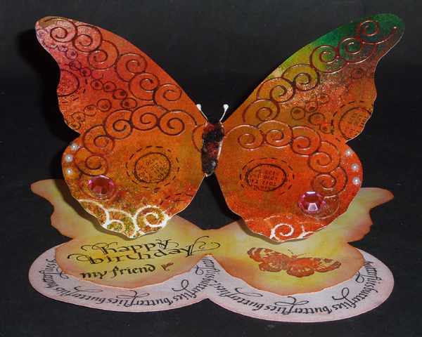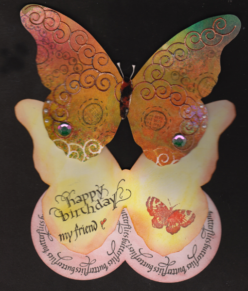 Created: Aug 11, 2012 I bought this Memory die "Curly Wreath" specifically for cutting it and then cutting it apart and putting it back together in an other configuration... It's a curly scalloped circle and I saw it as a beautiful vertical linear effect on a card... So I got a bit carried away here. I cut the curly wreath, reassembled it into a wavy vertical line and used it as a mask (notice the bottom wing edges and the white curls - and after using various sprays created this fabulous background. I looked at it and couldn't decide what I wanted to do with it. It was too large for a card, so ended up cutting it with my electronic cutter into this large solid butterfly. I'm using various stamps - Happy Birthday, part of a Friendship Quote Marks stamp - "my friend", butterfly and butterfly circle - from Quietfire Design |