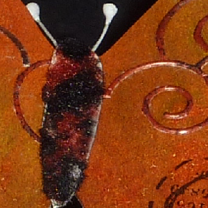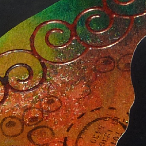 As I mentioned above, I used the curly wreath as a mask for the background using mixes of Distress reinkers and some Dylusion ink sprays, then applied Perfect Medium to the strip of curls and embossed with Carnelian and sprinkled with Hematite embossing powders. Stamped various design elements (Dylusions) on the butterfly using Versafine Black Onyx. added the white half pearls & large rhinestones. Cut out a body and applied Black & Rust flocking. Adhered to butterfly and added antennae using floral stamen. Cut out the base butterfly and sponged Distress Mustard Seed and Dried Marigold. Then cut and adhered the supporting easel legs for the main butterfly. As you can see by the above photo, the butterfly hovers over the card. I then stamped the butterfly circle stamp onto some cardstock, using a mask where the 2 circles join, die cut it with a Spellenders circle die and my rubber mallet, sponged some Spun Sugar around the edges and adhered them to the back of my card base. Added a little doodle heart and colored with Prisma colors. |