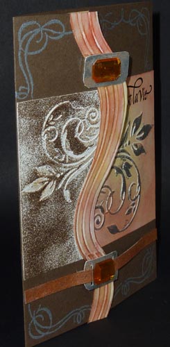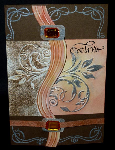 thing led to another as it usually does... So ran a piece of white cardstock through my machine in the curve area and did that 3 times, matching the end of the curve to the embossing folder to get my length. Cut out the curve, sponged with Distress Scattered Straw and Dried Marigold, clear embossed. Stamped the French sentiment with Versafine Black Onyx and clear embossed. Adhered my halves to my card front trimming where necessary. Adhered my curve. Now I needed something to hold the card closed... So hand cut a rectangle from some scrap silver embossed cardstock on my desk, which I folded in half to get a double thickness. On the lower one I cut slots for my ties. Adhered a large amber rhinestone rectangle. The ties are made from Grungepaper and stained with Distress Stains "Tarnished Brass". The left tie is attached to the card and wrapped around the slot in the buckle. The right tie is only anchored on the right edge and slips into the right hand slot of the buckle. I should have thought of the flourished border (Quietfire Design) at the beginning... but only thought of it at the end, so had to mask my areas to stamp using Perfect Medium and embossing with the pearlescent embossing powder. Looks silvery. |