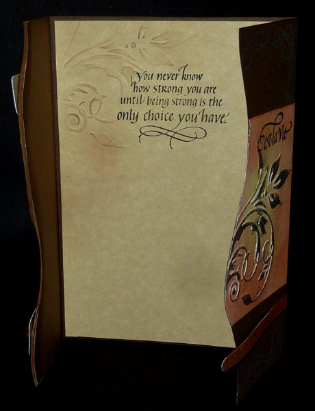 I stamped another quote (Quietfire Design) on the inside on parchment toned paper using the Black, then decided to use the embossing folder to add the some interest. I very lightly tapped my mallet on the folder, then lightly sponged the area with my dirty brown sponge.