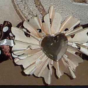 Stamped my sentiment with Versafine Vintage Sepia and clear embossed. Lay a piece of Sookwang tape down and then stated to pleat my dark brown/white polka dotted ribbon. Adhered a piece of Sookwang tape to a narrow cream toned ribbon and adhered that along the center of my pleated ribbon. Scored a piece of cream toned cardstock, then used my rubber mallet and a Spellbinders border die (Floral Doily Accents set) and cut one side of the die. Adhered the rosette to a punched out circle, then added the larger smoky rhinestone heart. |