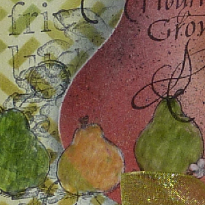 Adhered the pear mask to card. I used another of my newest EK Success deep edge punches "Brick Pattern". I punched a piece of cardstock, turned my cardstock and punched the other side, then used it as a stencil, randomly sponging Distress Scattered Straw, Peeled Paint & Broken China over the whole front. I then stamped a whole pile of stamps all around and off the edge of the pear mask using Distress Black Soot. Sponged some of the black just on the edge of the mask. Removed mask and adhered the stencil of the pair (the negative portion of the die cut). Sponged Scattered Straw all over the pear, then went in with Aged Mahogany and then a touch of Dusty Concord. added a touch of Corduroy on the stem and waist of the pear. Splattered my black Sumi ink pen for the speckles. Used a white colored pencil for highlights. Stamped the 3 pears (Flourishes "Pears" set #177) with Versafine Black Onyx, colored them with a white pencil then with a green or yellow pencil. Stamped my sentiment with the Versafine black. Tied a large peg bow from a bright wide green ribbon. Adhered it to card and also tied it down with thin wire and seed beads. On the inside, hide the wire with the smallest pear die cut. |