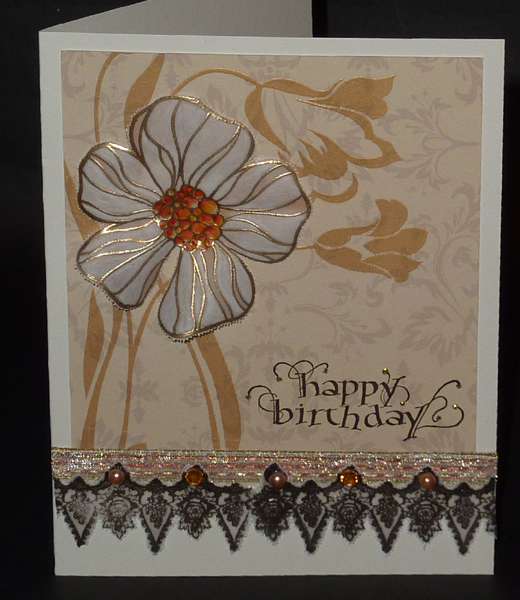 alcohol markers. The lace border is a Flourishes stamp from the Lace Edges set #86, stamped on vellum with Versafine Black Onyx and clear embossed. Perforated with the piercing tool to get the ragged edging. Adhered to a piece of gauze beige ribbon with Glossy Accents. The main card is cream toned. Trimmed a piece of Kanban cardstock to fit front, adhered the gold/copper ribbon, then the beige gauze/lace piece. Stamped the happy Birthday with the black. Added Stickles gold dots on each of the stamped dots. Adhered the vellum flower with Glossy Accents. |