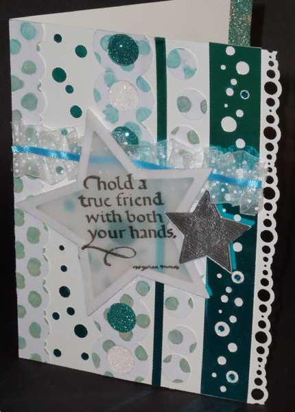 I punched out designs using EK Success slim edgers and large edger border punches (Deco Scallop, Swiss Cheese, Bubbles, Le Circle) from both the painted dot background and a metallic aqua cardstock and the edge of the main white card. I also adhered the drop out pieces. I added Ritz micro fine glitter in the large negative circles both in an aqua color and a warm highlights. Added aqua rhinestones in other negative circles. Put a strip of silver adhesive glitter sticker paper which I colored with aqua alcohol inks. Ruffled a white polka dotted gauze ribbon onto a piece of double sided tape, then adhered the thin aqua blue ribbon on top. Adhered the assembly to the card. Stamped the quote onto a piece of translucent vellum using Versafine black onyx and clear embossing. Die cut with Spellbinders "Stars Five" die set. Die cut another star from white cardstock, the same size but nested the next size down to make an open border for backing the vellum, which I then adhered with glossy accents. Die cut the aluminum metal star and backed it onto white cardstock as well. Pop dotted both stars onto the card. |