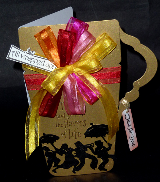 cut two so the backside would be as pretty as the front. Stamped the dancing people (Flourishes "Mardis Gras" #14 set) on white cardstock, cut around image and embossed with black embossing powder. Like the silhouette image. Adhered to gold layer. Stamped the quote with black and clear embossed (it changed color while it was being embossed, strange). Adhered the red wrap around ribbon and the handles, then adhered it to my main card below. I scored and folded my card and then cut it out with the Flower Pot die, keeping it shy of the cutting edge of the lip of the pot. Adhered the jumbo bow. Stamped the "all wrapped up" (Flourishes set #45) with Versafine Black Onyx and cut around the image and adhered to the bow. Stamped the "Just for you" with the black, Sponged some Distress red around edges, trimmed around words, punched a hole and added the gold ribbon, adhering the two ends around the cup handle. |