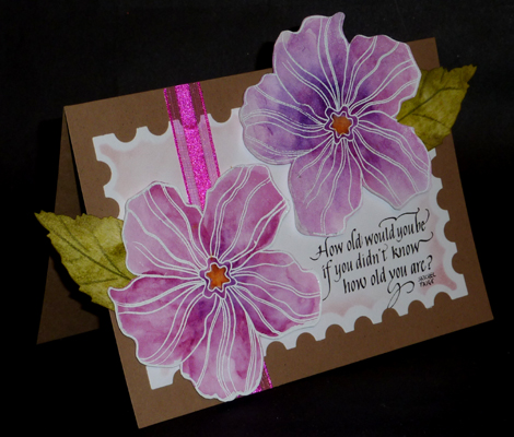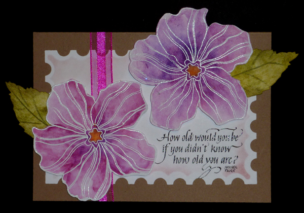 with white embossing powder. Used a Spellbinders postage die to create this postage which is wider than the die... using my hard rubber mallet. Stamped the quote with Versafine Black Onyx and clear embossed. Sponged Distress Spun Sugar around the edges. Adhered to my top folded kraft card. Adhered the fuchsia ribbon and then pop dotted both flowers. Applied direct to paper various Distress greens on the front and the back of white cardstock, then sponged some green to blend the colors. Die cut with Sizzix Tim's Tattered Leaves die, added veins with a colored pencil and adhered to card. |