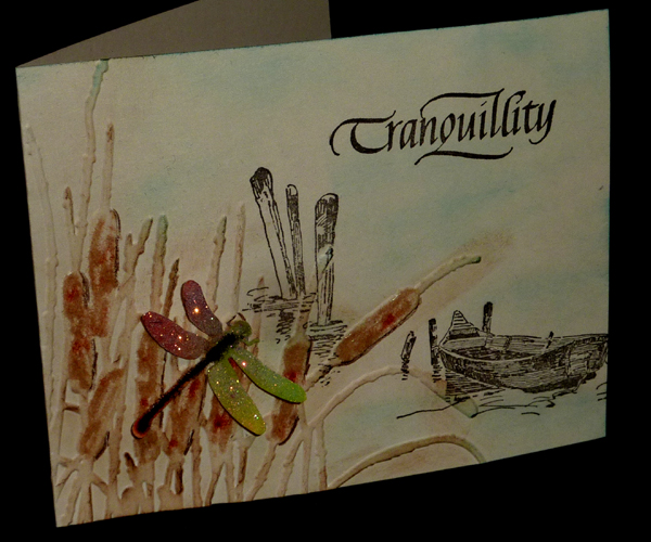 I side folded cream cardstock and ran through my embossing machine with the Sizzix "Cattails" embossing folder. Sponged some Distress Gathered Twigs on the high points then adhered some flocking to mimic the fuzziness of the cattails. Stamped the boat and pilings (Beeswax Rubber Stamps) with Versafine Black Onyx. Sponged some Distress Tumbled Glass in the sky area. Stamped my sentiment with the black. Punched out the dragonfly from some scrap decorated paper, applied Ritz micro fine glitter "Warm Highlights" on the wings and black flocking on the body, adhered to card. |